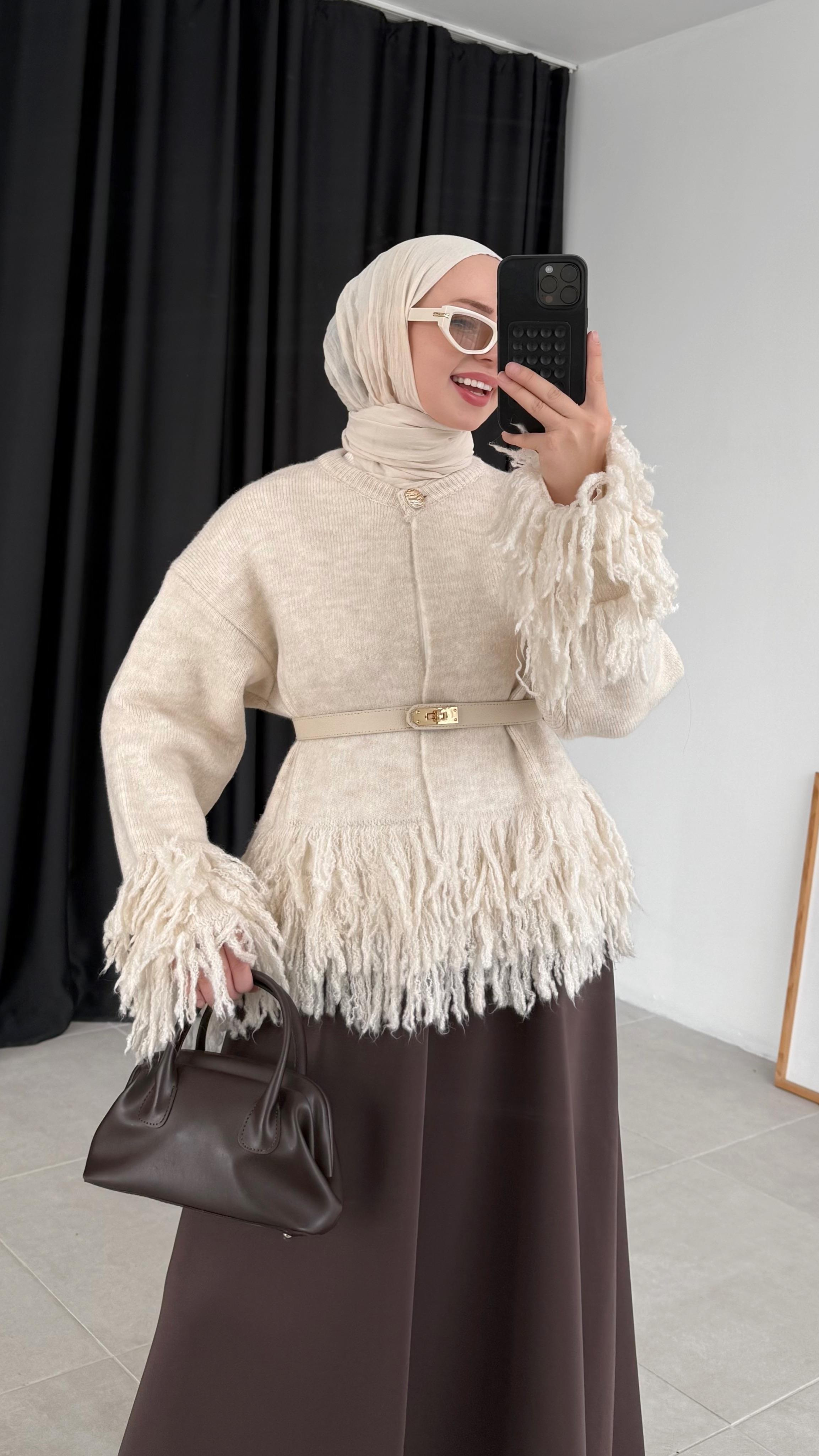 Akel Püsküllü Krem Triko Hırka