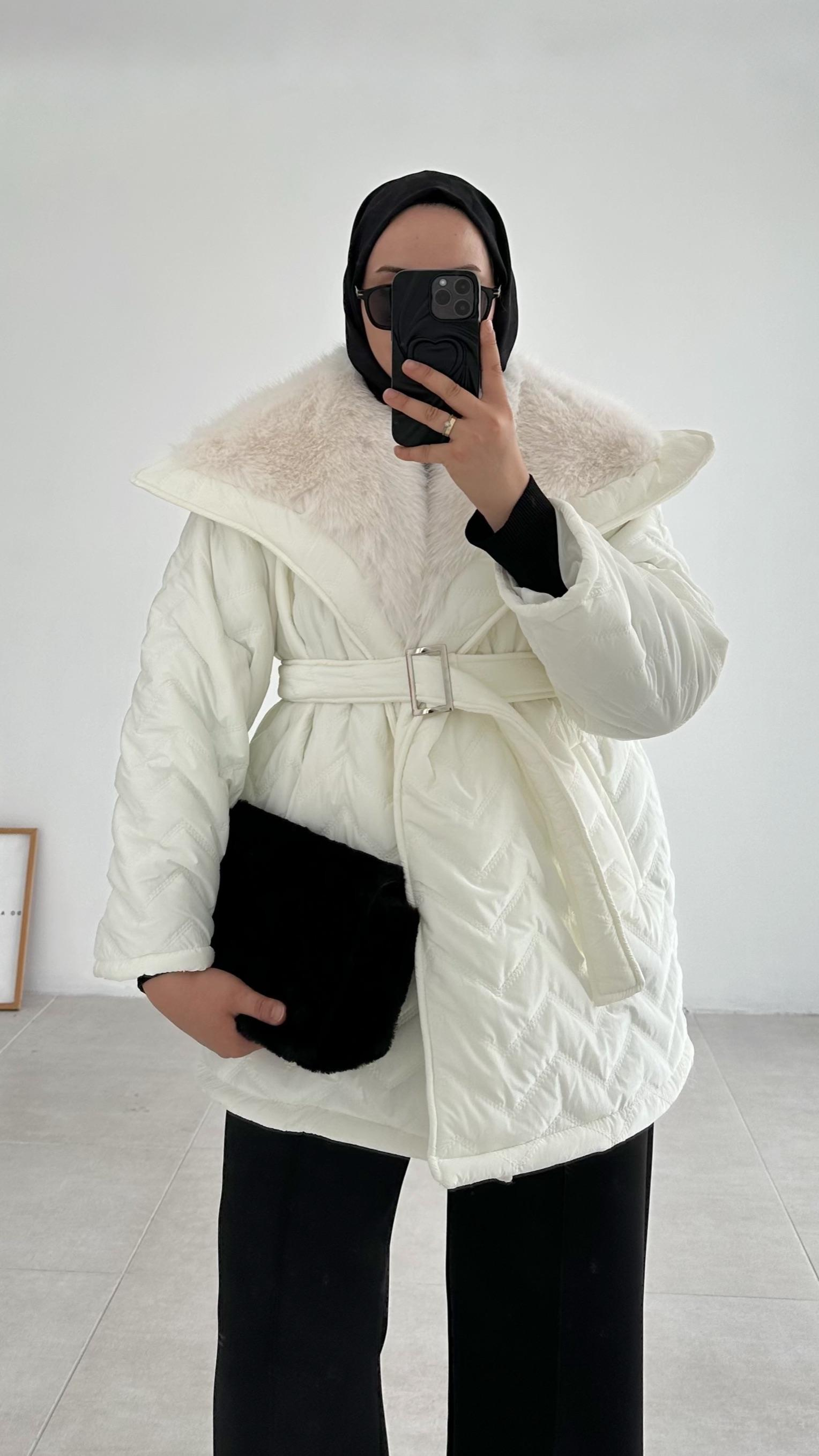 Elani Yakası Kürklü Premıum Ekru Şişme Mont (1806)