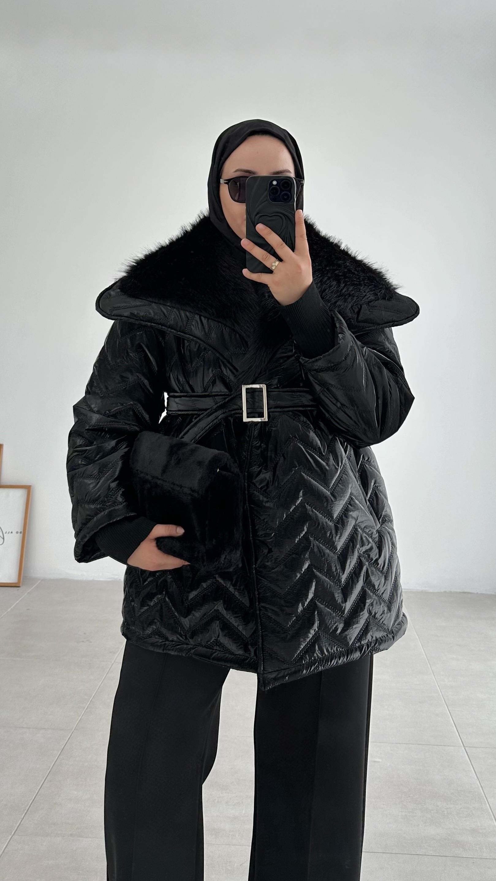 Elani Yakası Kürklü Premıum Siyah Şişme Mont (1806)