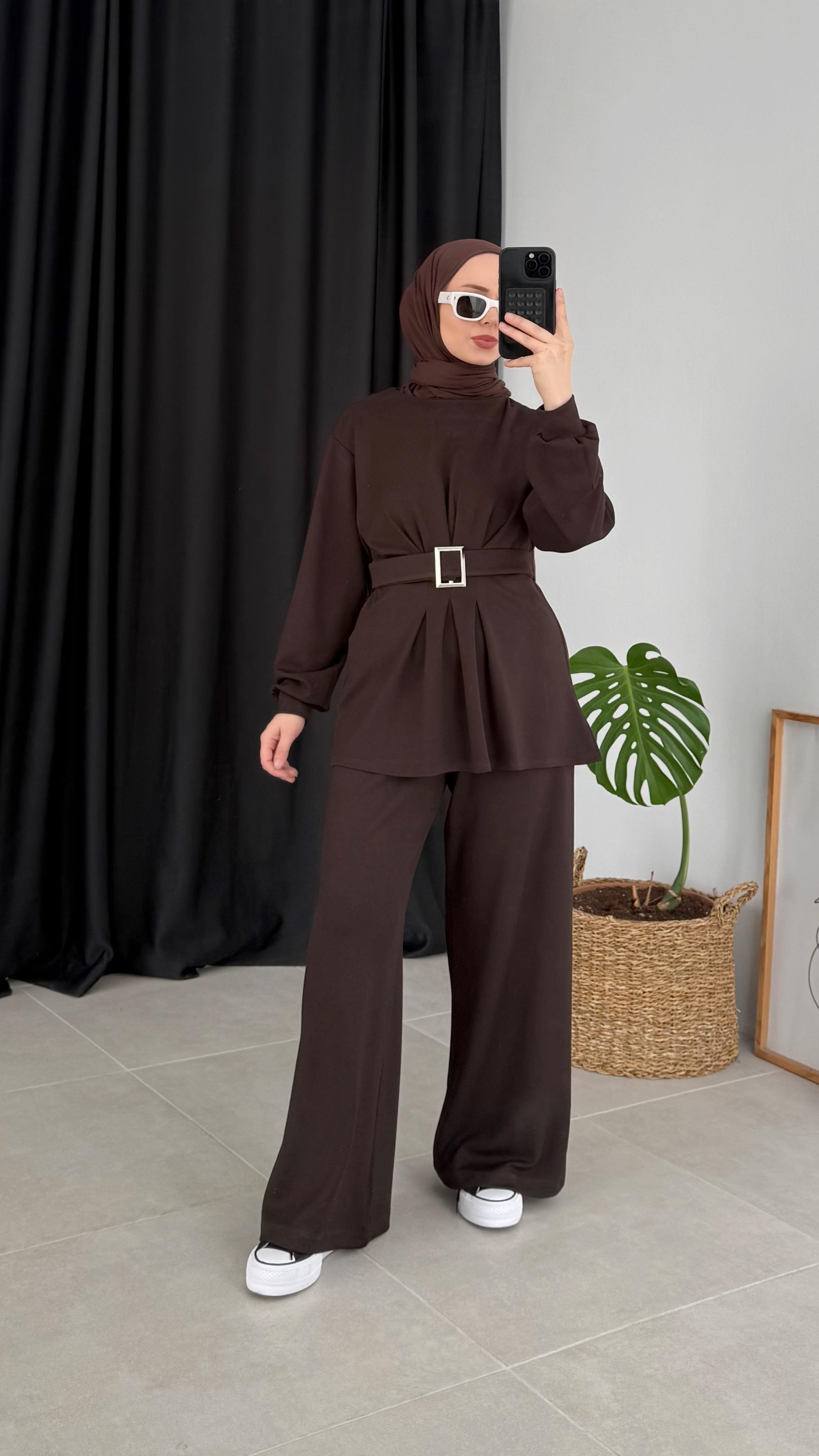 Holon Kuşaklı Pileli Oysho Kahverengi Takım (1825)