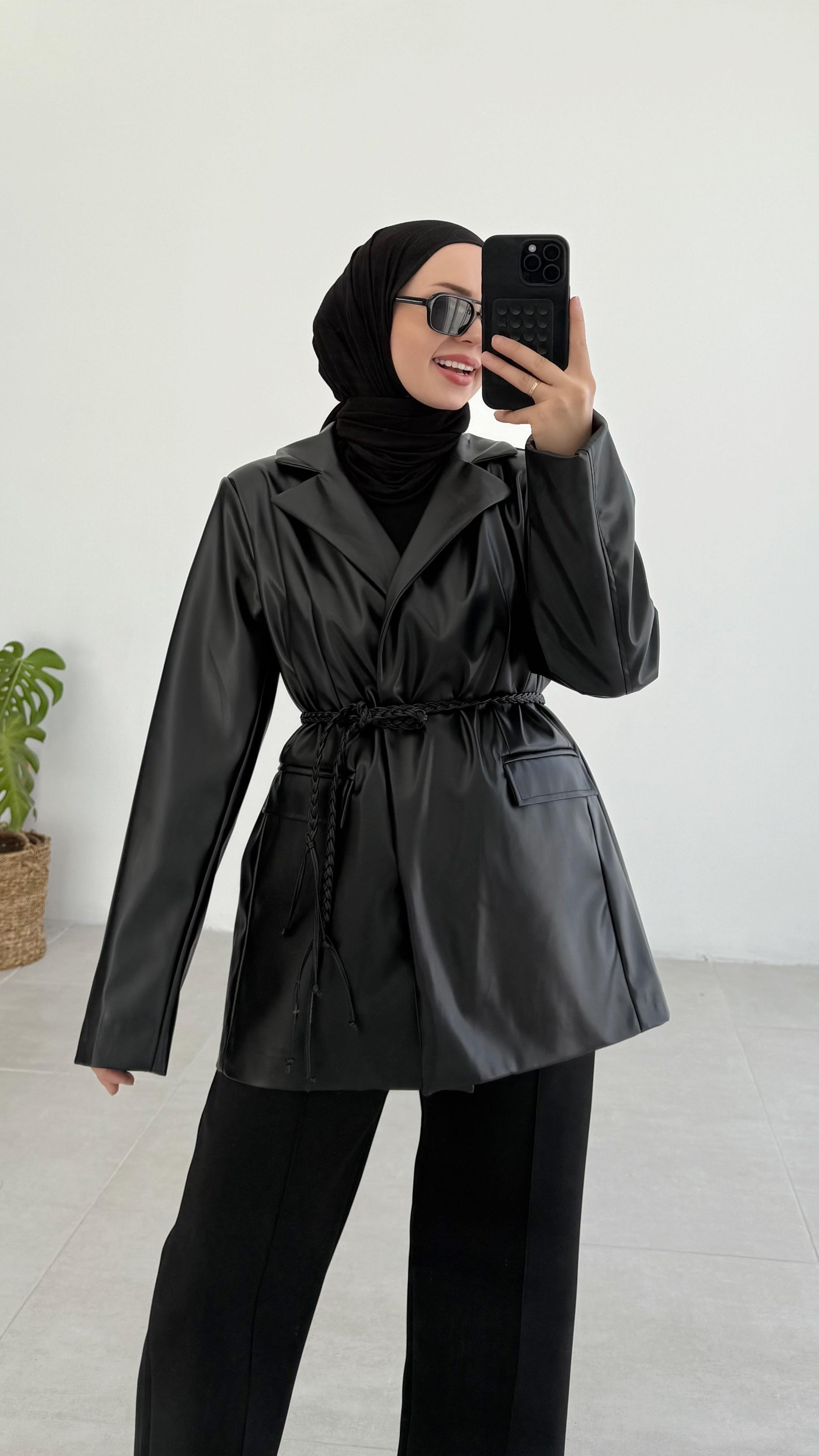 Massi Örgü Kemerli Premıum Siyah Deri Ceket (1779)