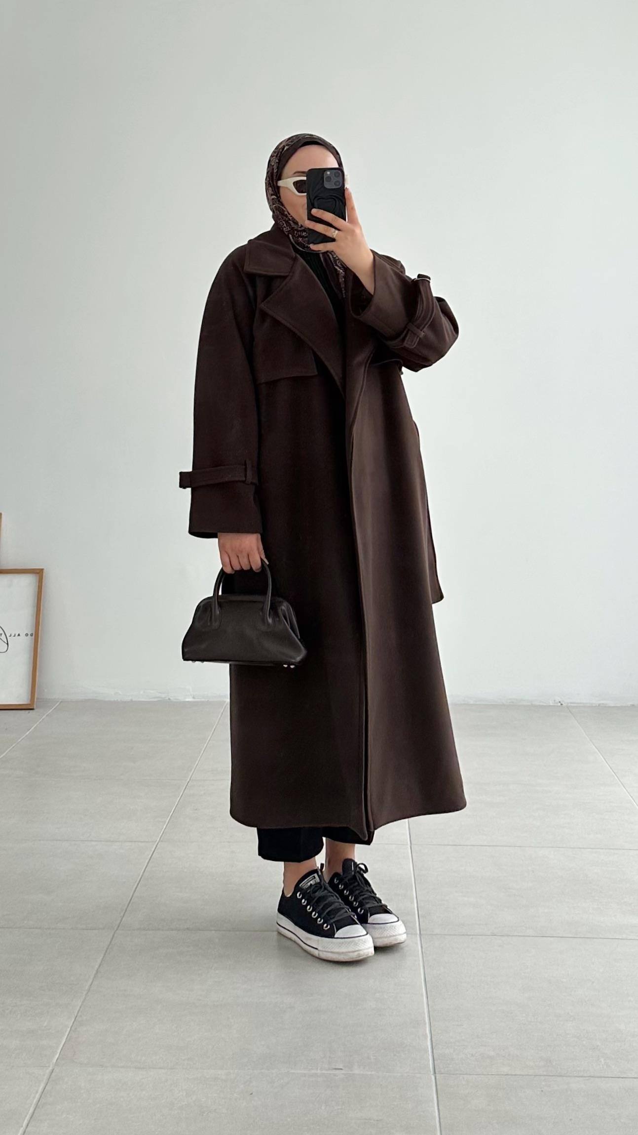 Maude Rüzgarlıklı Uzun Kahverengi Kaşe Kaban (1799)