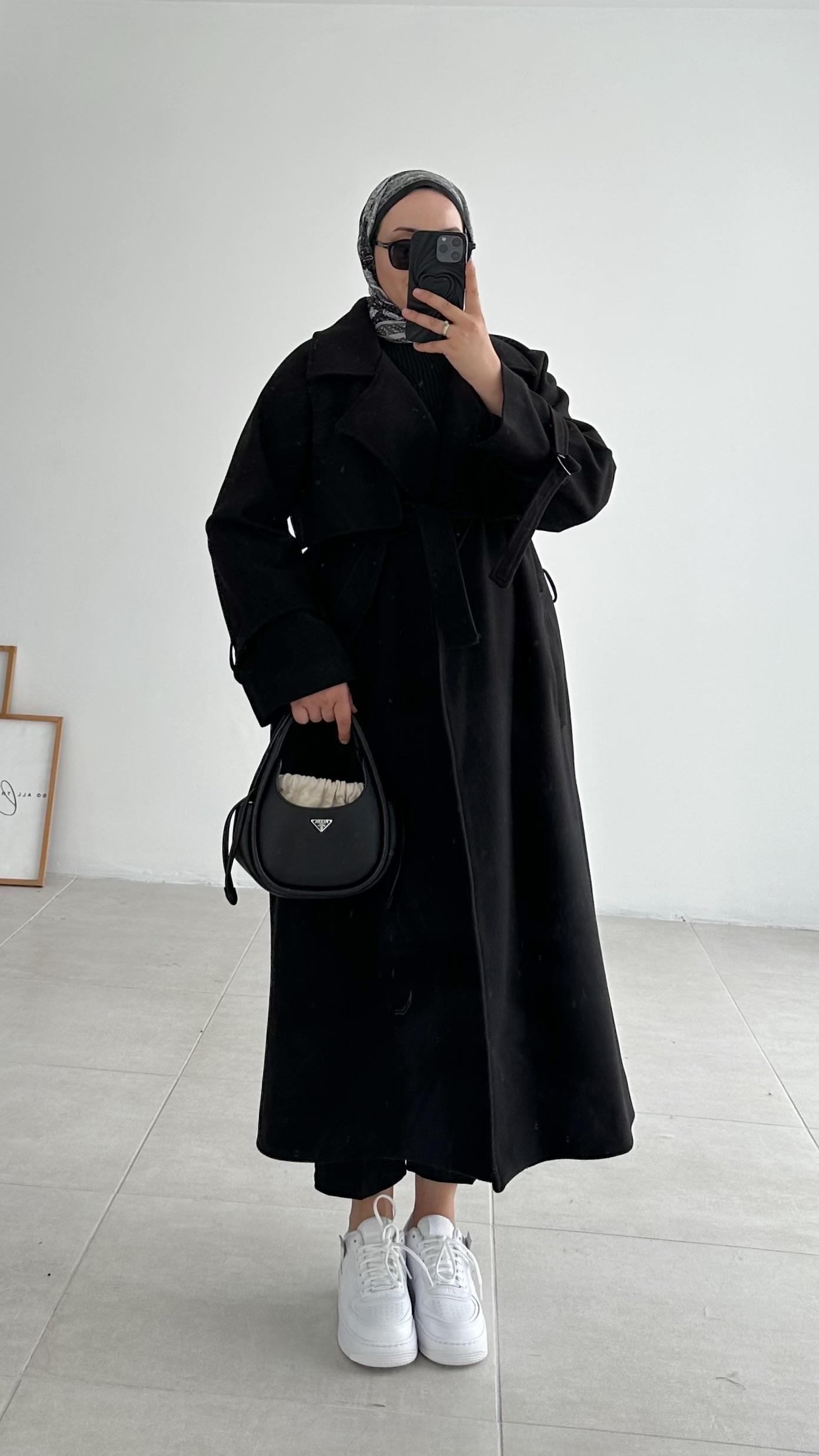 Maude Rüzgarlıklı Uzun Siyah Kaşe Kaban (1799)